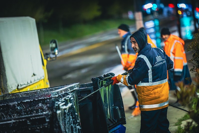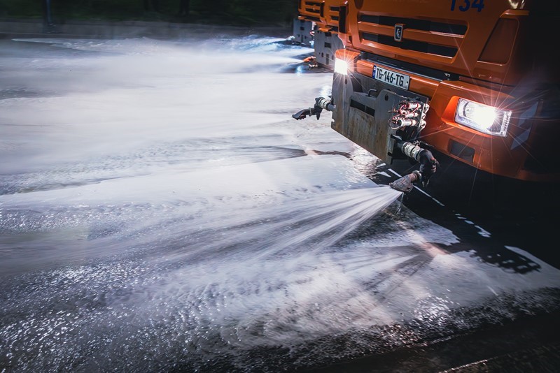 With the help of special equipment, the roadway, public transport stops and waste containers were thoroughly cleaned.